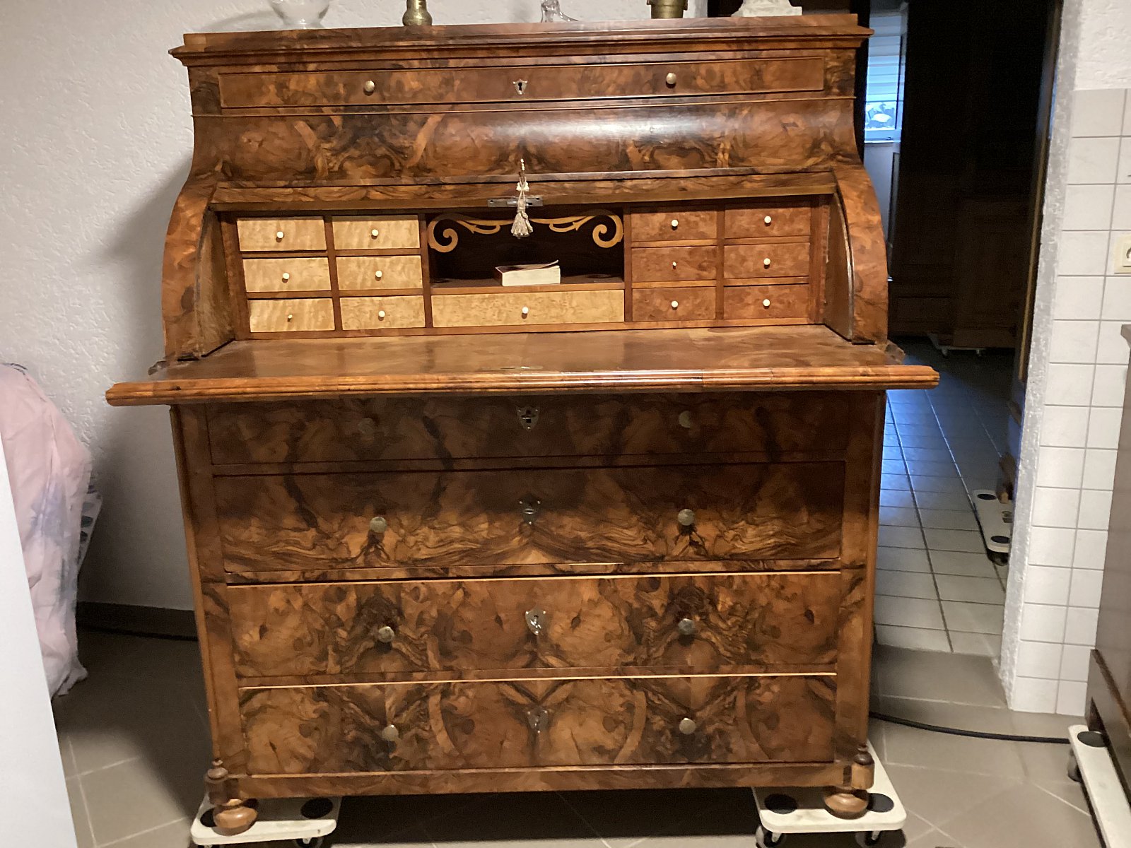 Antiker Zylindersekretär, Wurzelfurnier, Nussbaum, versiegelt.