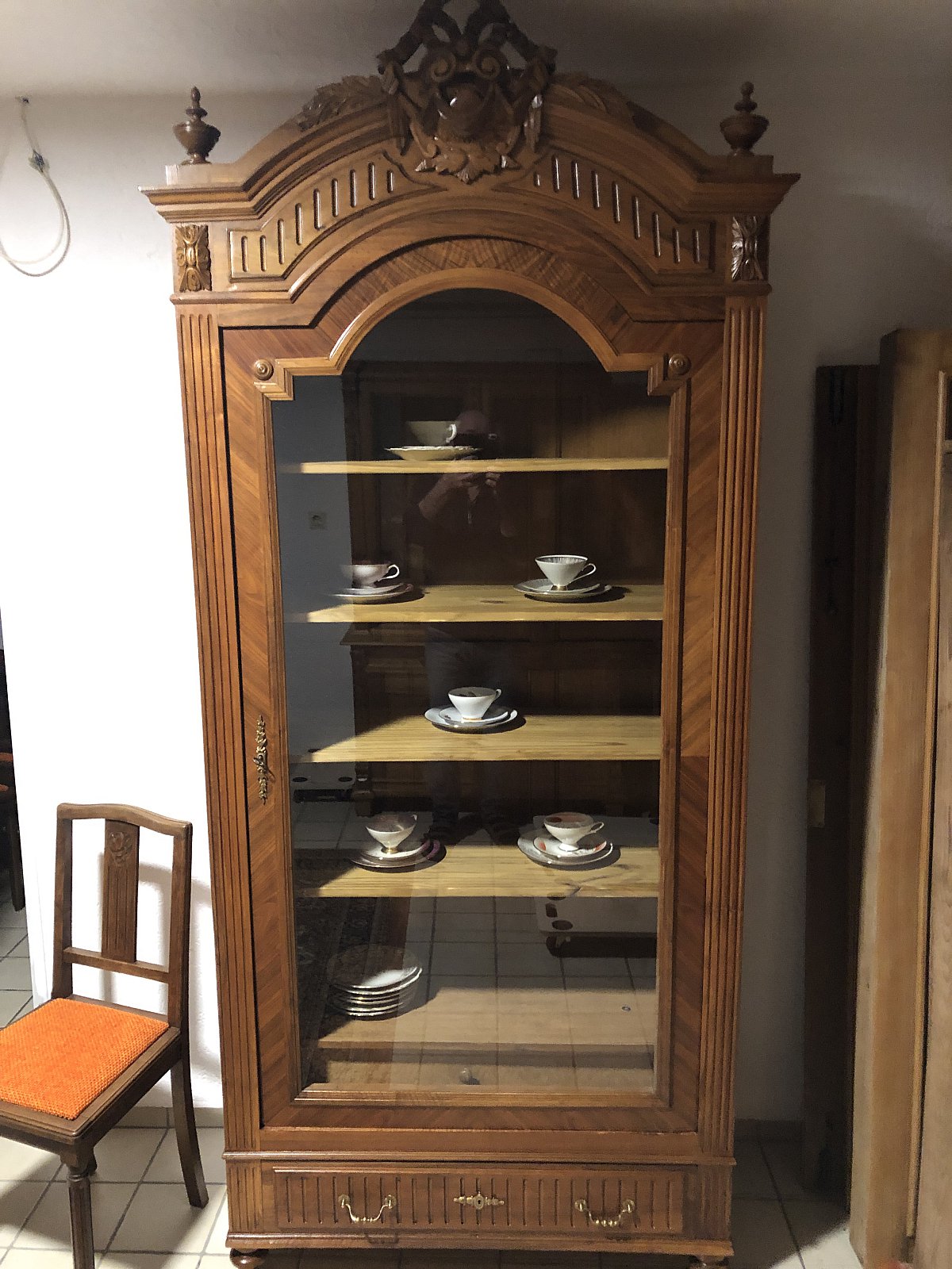Dieser Vitrinenschrank ist Nussbaum furniert und ist aus der Gründerzeit. Er hat unten und innen jeweils eine Schublade und 4 Böden. Der Schrank ist versiegelt.