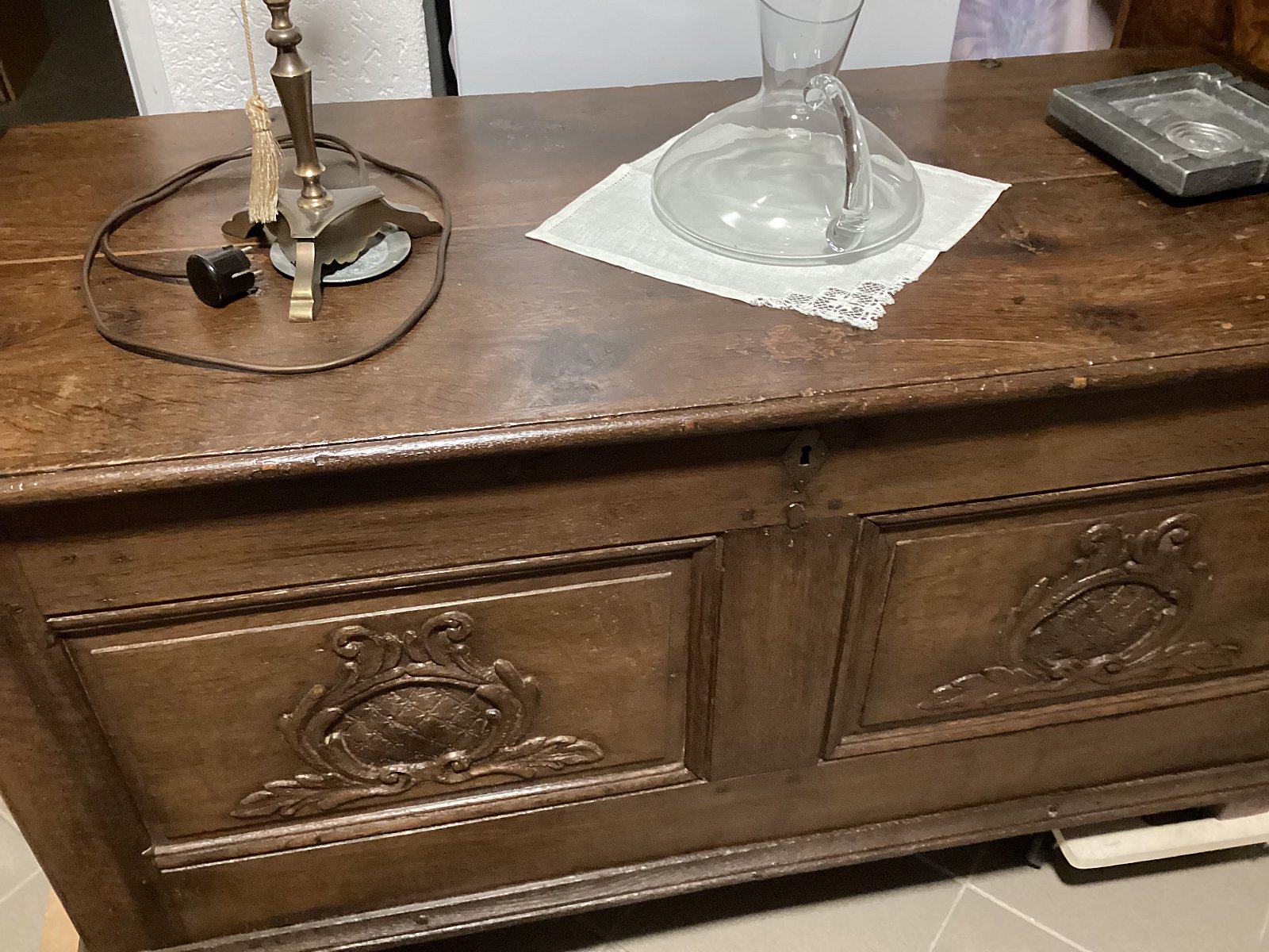 Antike Truhe mit Geheimfach, Eiche massiv, Biedermeier, gewachst.