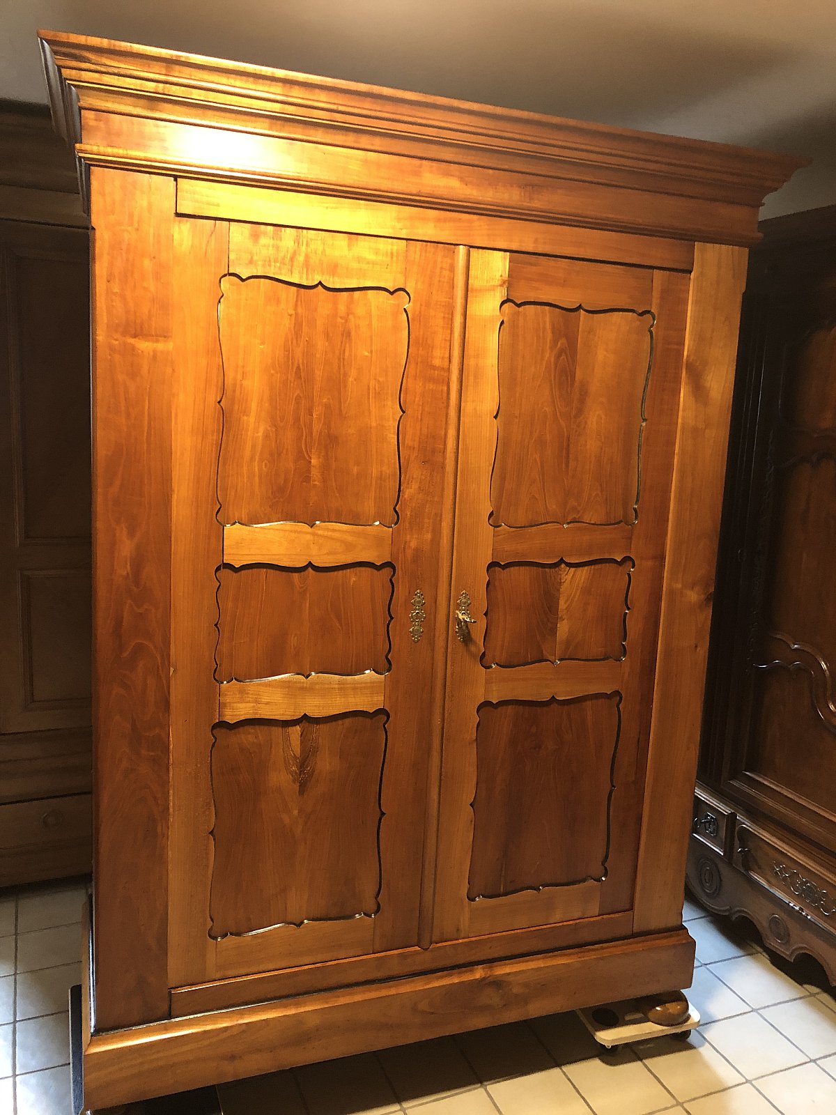 Antiker Kleiderschrank, Kirschbaum massiv, Biedermeier, 12 Kassetten, klassisches Innenleben, gekeilt, versiegelt.