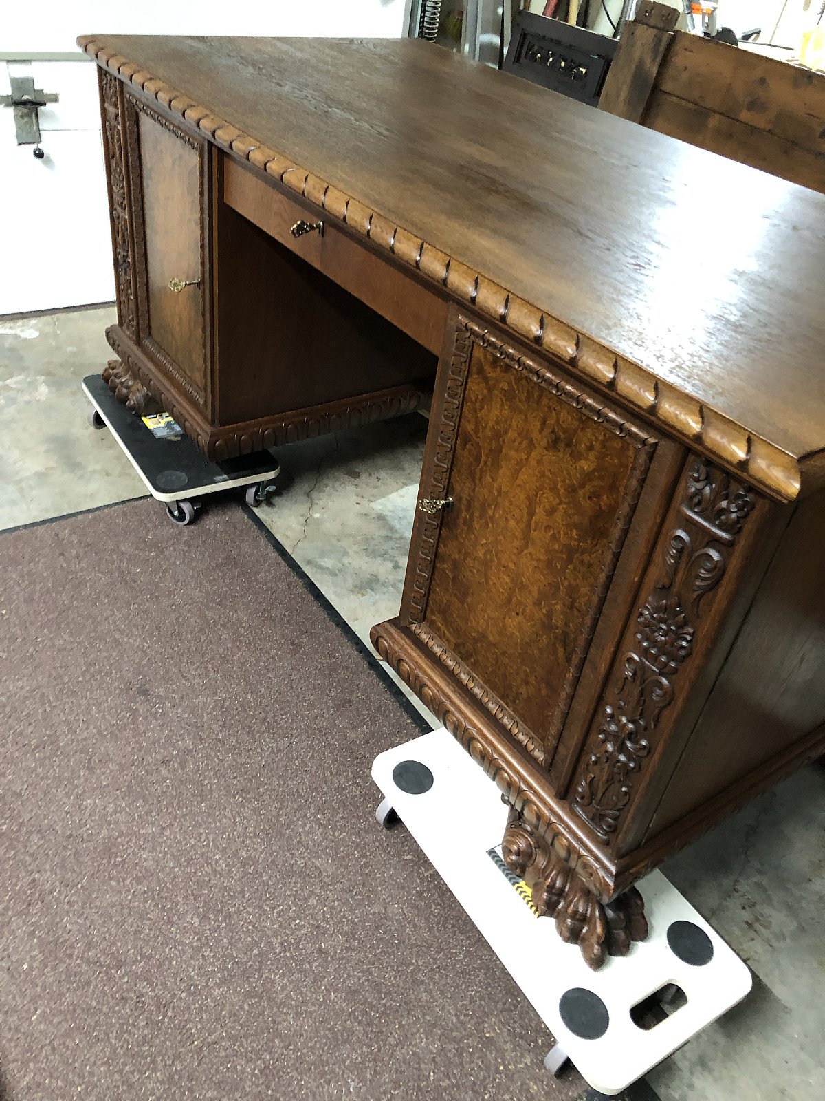 Großer antiker Schreibtisch mit Tatzenfüßen, Eiche, Kassetten in den Türen mit Vogelaugenahornfurnier, 2 Türen und eine Schublade, freistehend, schöne Verzierungen, Platte versiegelt.