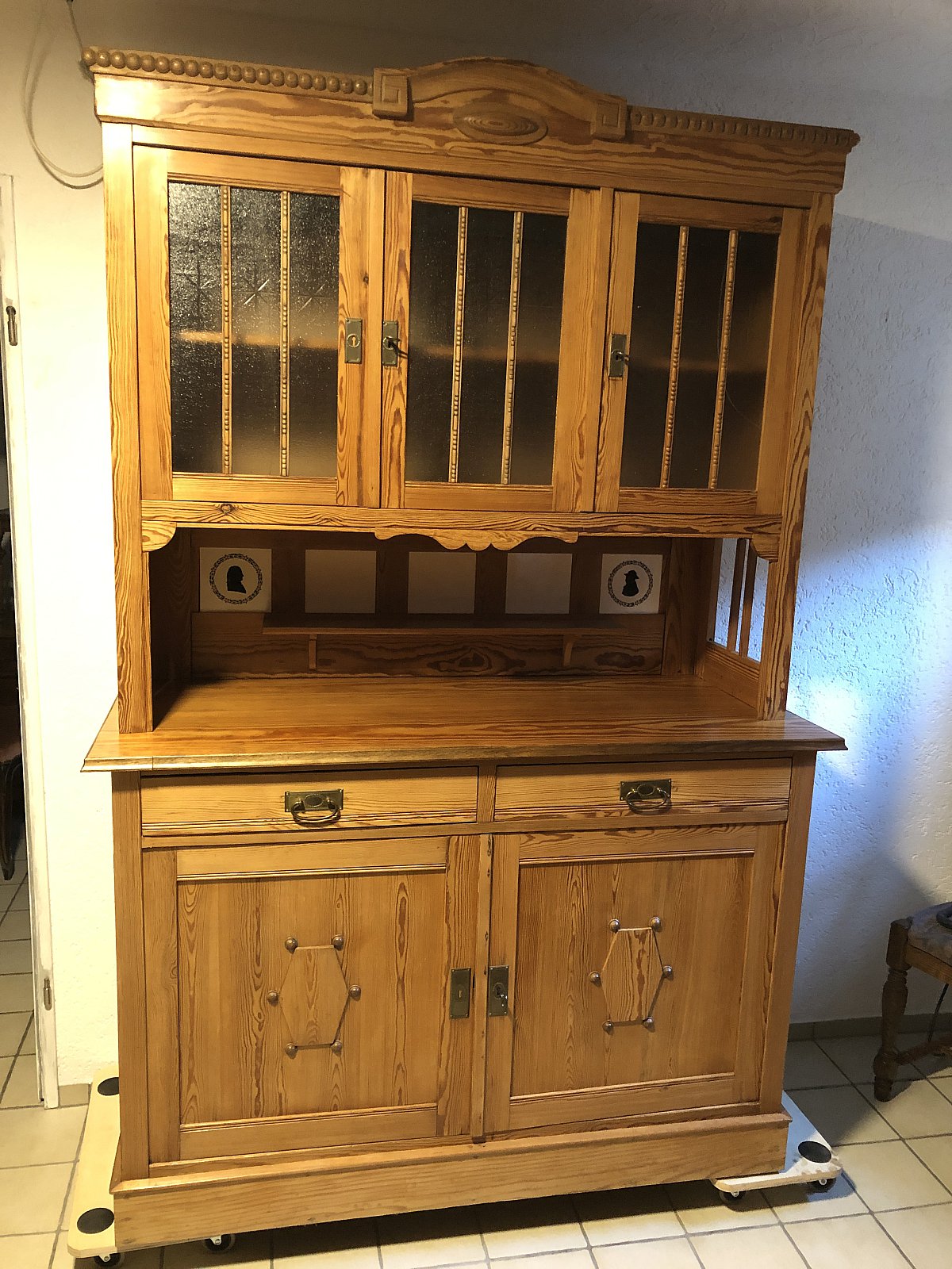 Antikes Buffet, Weichholz, Jugendstil, 5-türig, 2 Schubladen, originale Kacheln, Platte versiegelt, restauriert.