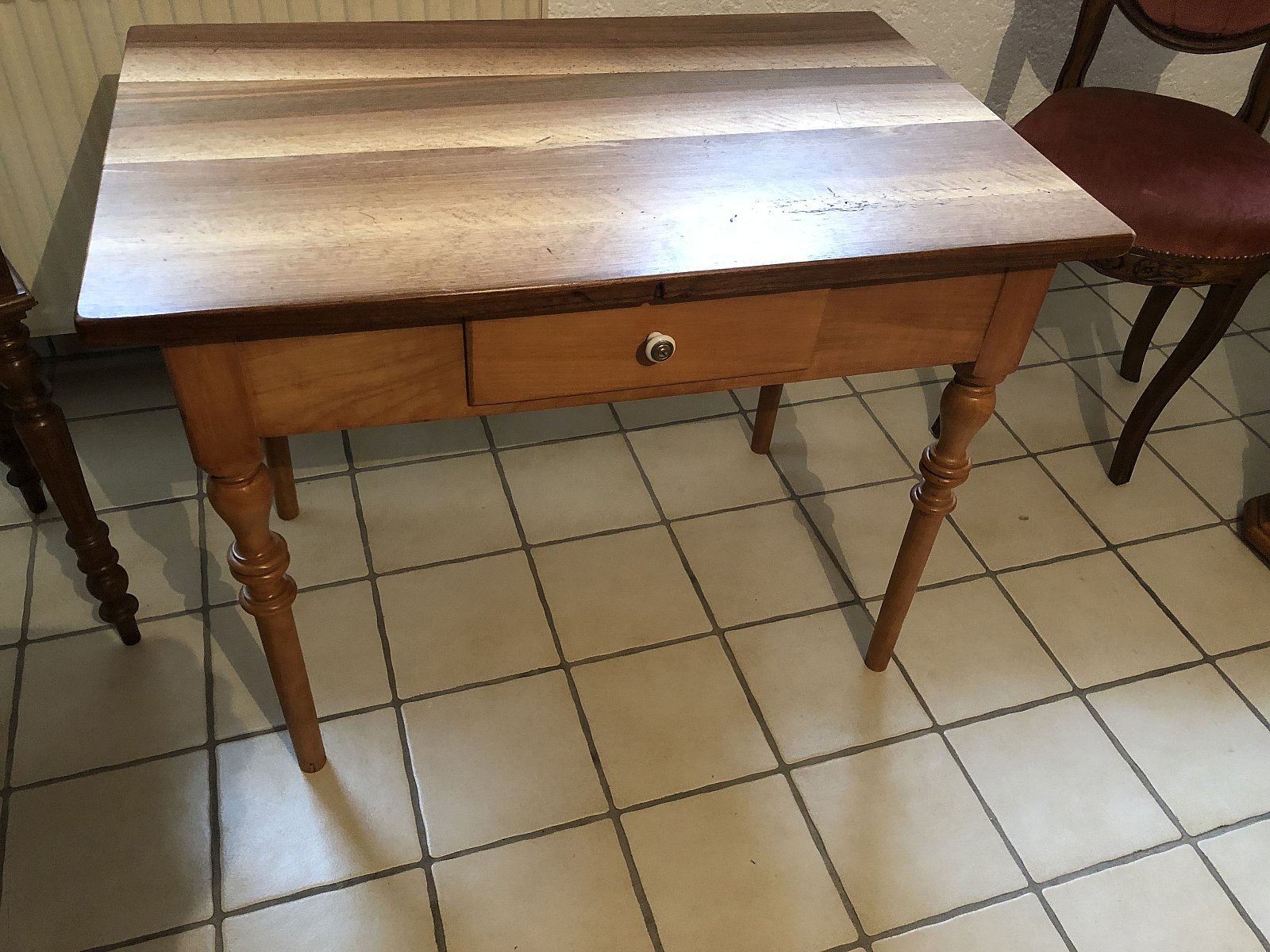 Der Beistelltisch ist aus 2 Hölzern gearbeitet. Das Gestell und die Platte sind aus Kirschbaumholz, die versiegelte Platte aus Nussbaum.