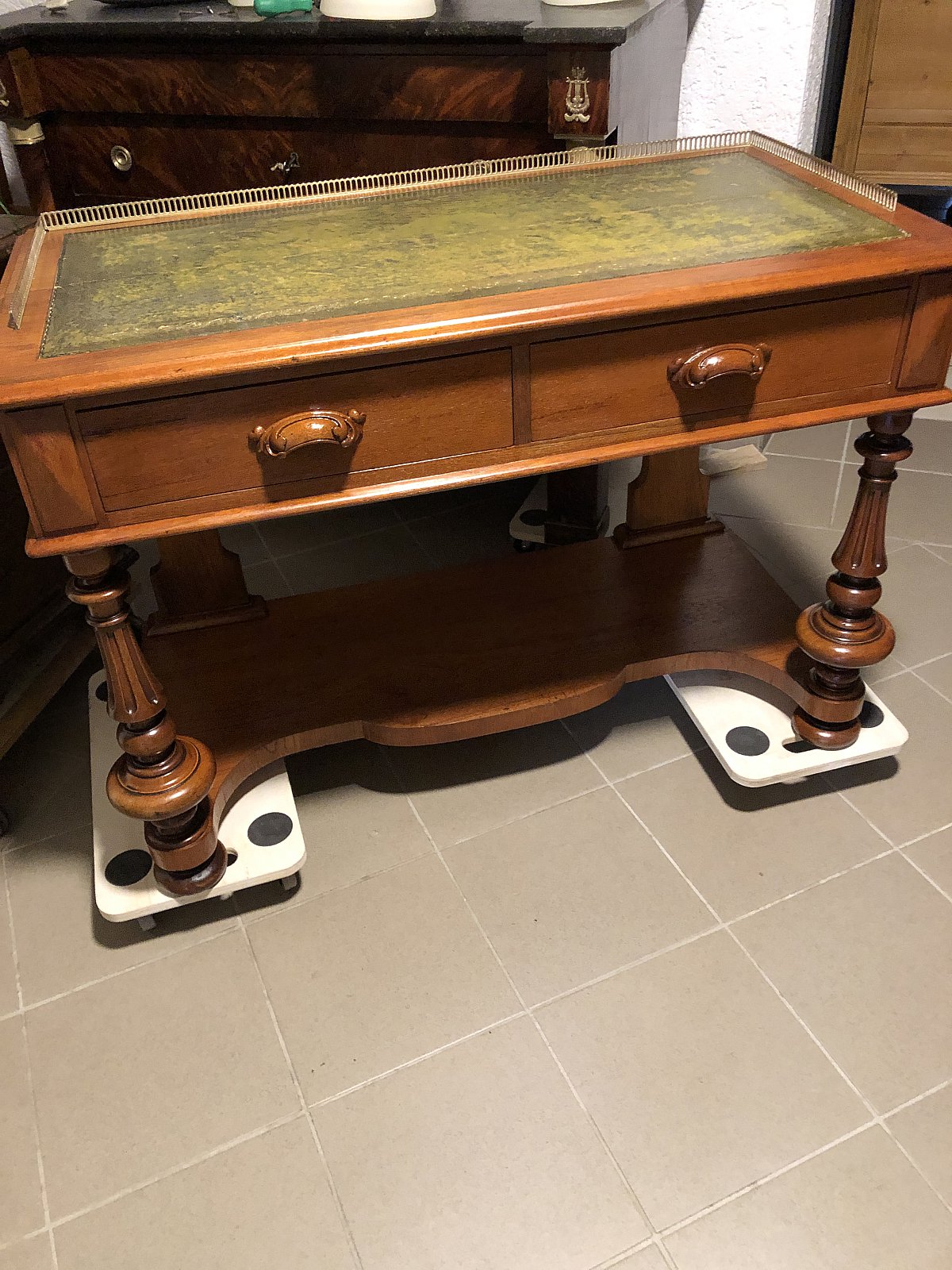 Der kleine Schreibtisch hat 2 Schubladen, die mit Holzgriffen versehen sind. Die mit einer originalen Ledereinlage ausgestattete Platte wird vorne von 2 Säulen gestützt. Die Ledereinlage wird von einem kleinen Messinggeländer eingerahmt.